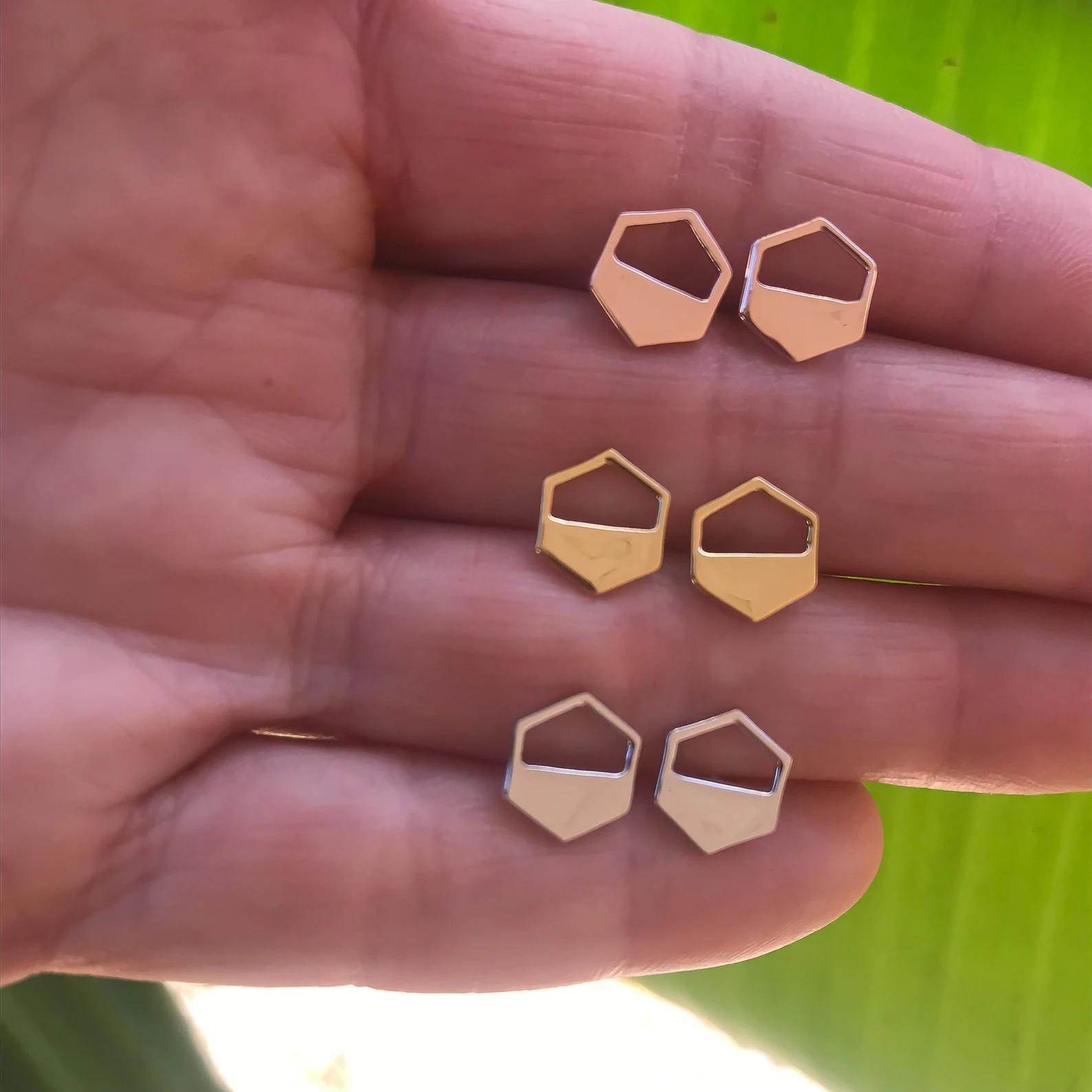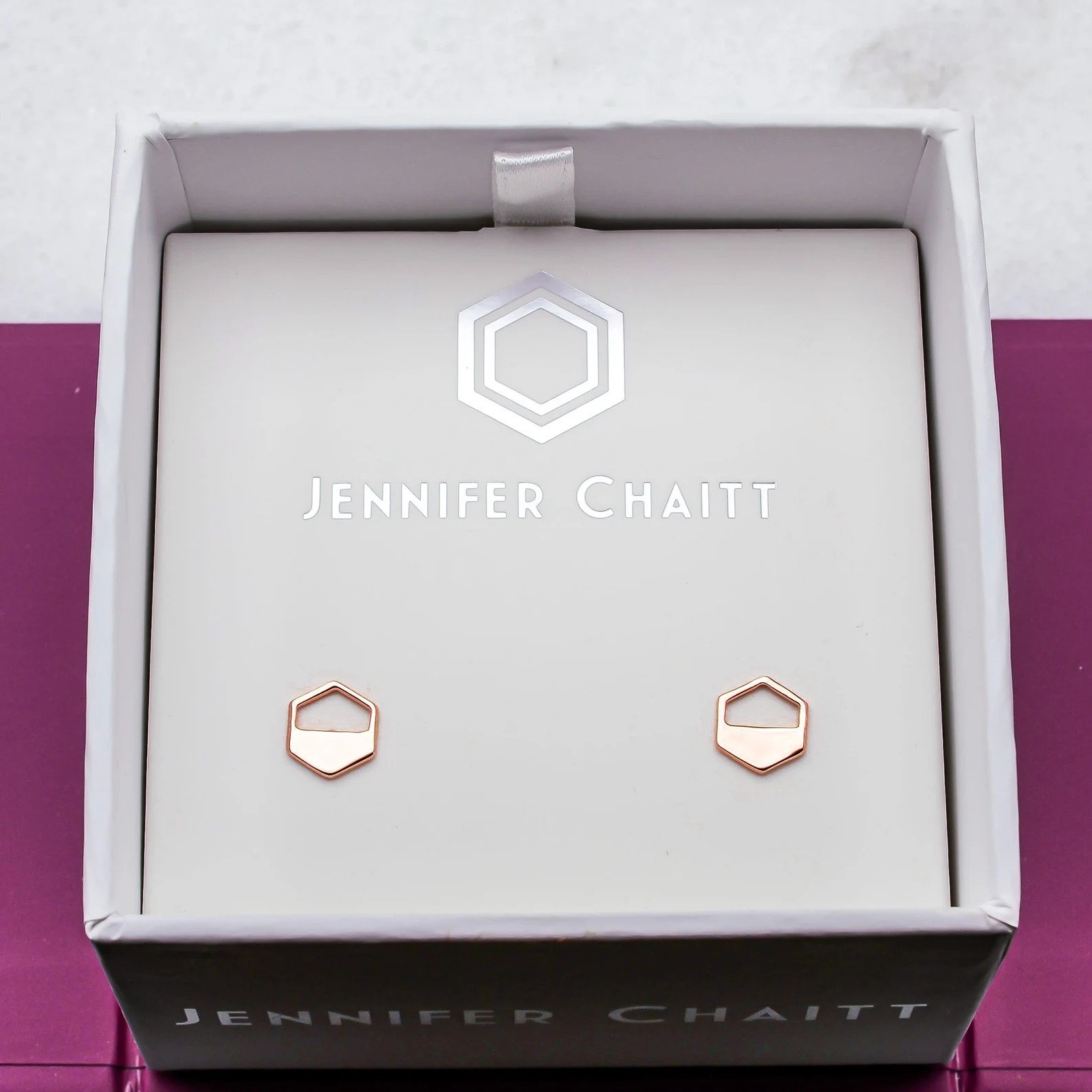 These rose gold hexagon cutout earrings will become instant wardrobe staples, offering a modern, geometric take on the classic half-moon stud earring. The clean lines and sleek cutout design are both striking and subtle—perfect for anyone who appreciates thoughtful minimalism. Designed by engineer-turned-artist Jennifer Chaitt, these low-profile studs are made for daily wear, combining lightweight comfort with sculptural beauty. Whether you're on the move or curating a chic capsule wardrobe, these earrings deliver on versatility and style.