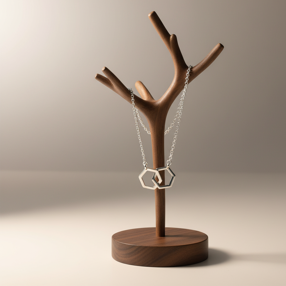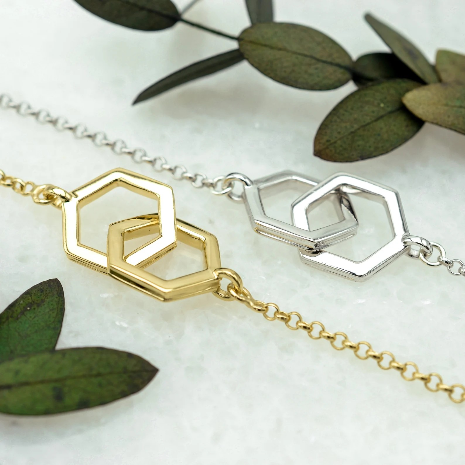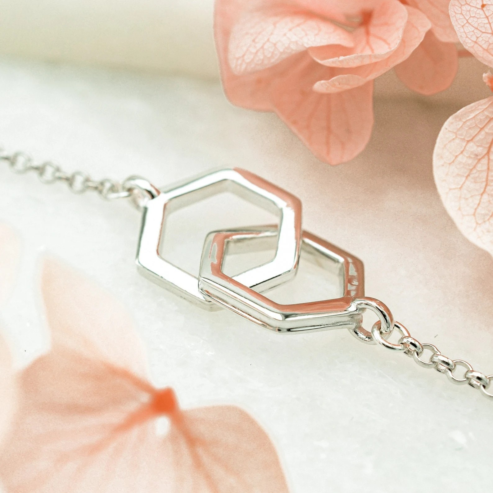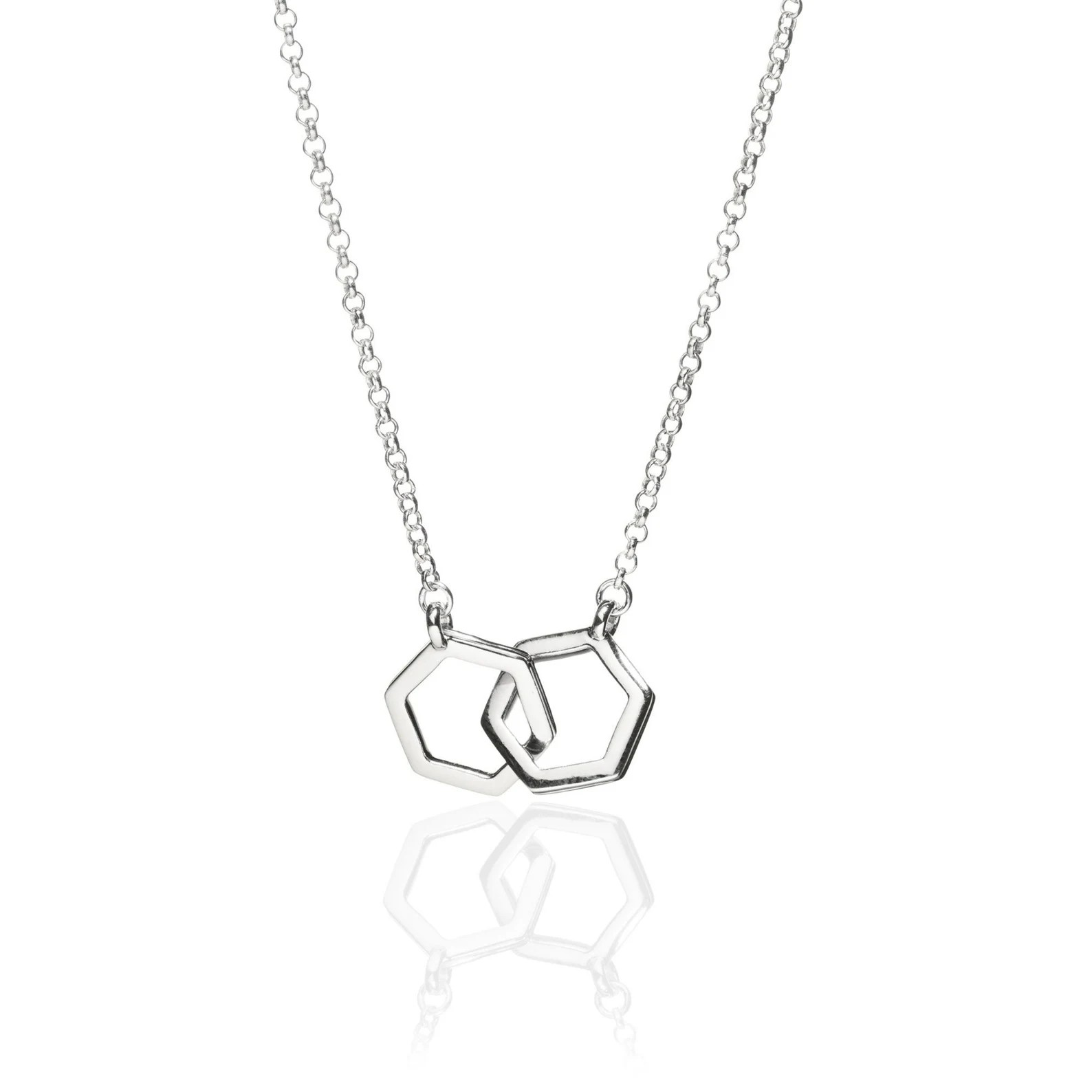 As a symbol of connection, this interlocking silver necklace was designed to celebrate the timeless bonds you share. Featuring two signature hexagons by engineer-turned-artist Jennifer Chaitt, the necklace blends modern lines with meaningful symbolism in a polished, minimalist design. Whether representing a relationship, friendship, or personal growth, this necklace offers a sleek and elegant reminder of what truly matters.