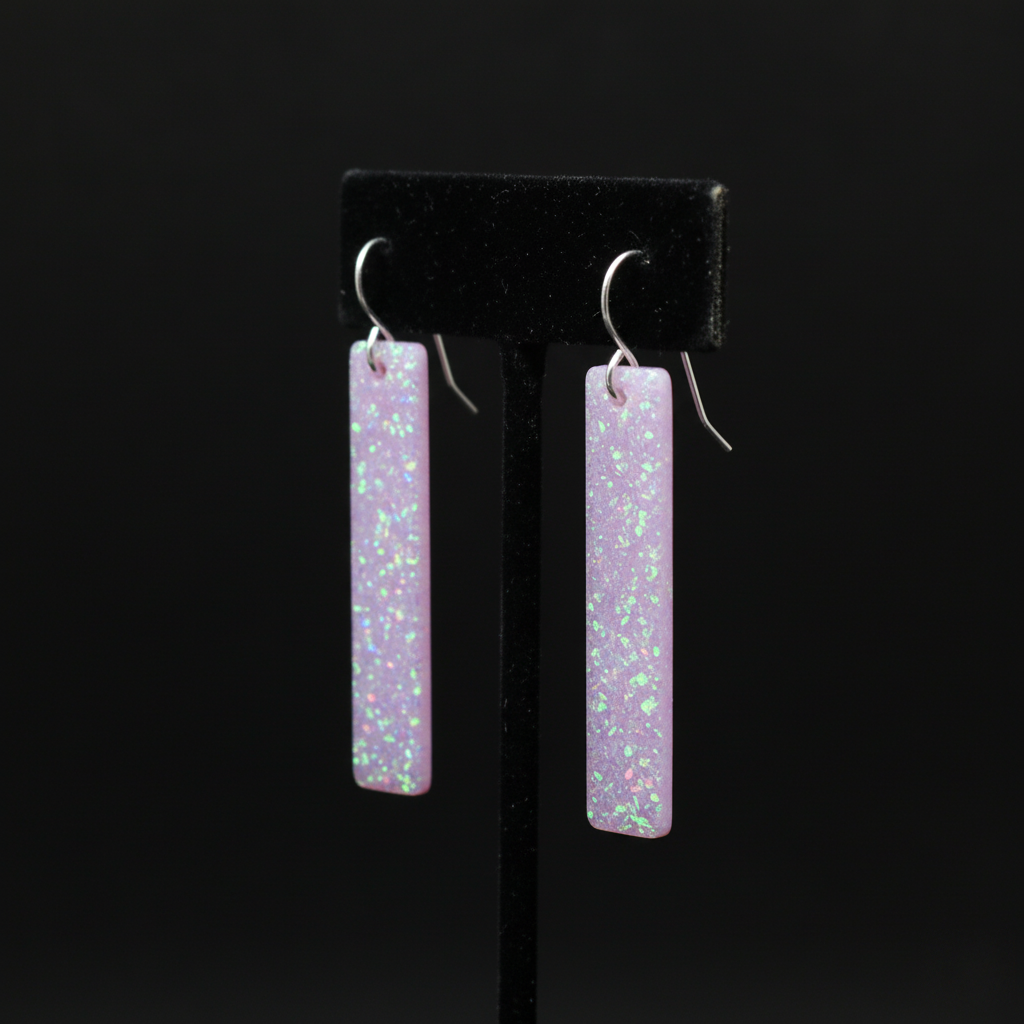 These Native American made opal earrings feature stunning rectangular bars of radiant opal in a soft lilac hue with shimmering flecks of iridescent green, blue, and pink. Each earring is crafted with care and precision, showcasing a modern yet timeless design that beautifully reflects light from every angle. The sterling silver hooks add a sleek, durable finish that makes them easy to wear all day long.