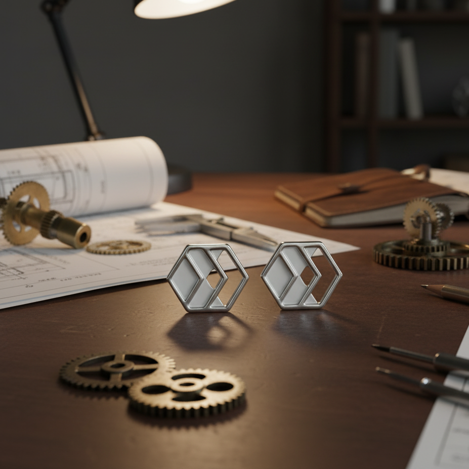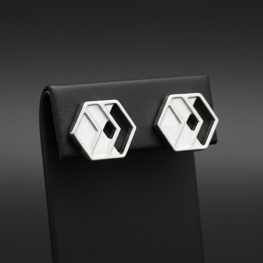 These effortless silver geometric hexagon earrings were created for the woman who loves clean lines and a polished look. With a sleek double-chevron design nested inside a structured hexagon, they strike the perfect balance between minimalist style and subtle dimension. Designed by engineer-turned-artist Jennifer Chaitt, these studs feature a low-profile silhouette that minimizes the risk of snagging—making them ideal for moms, travelers, and anyone with a busy lifestyle.