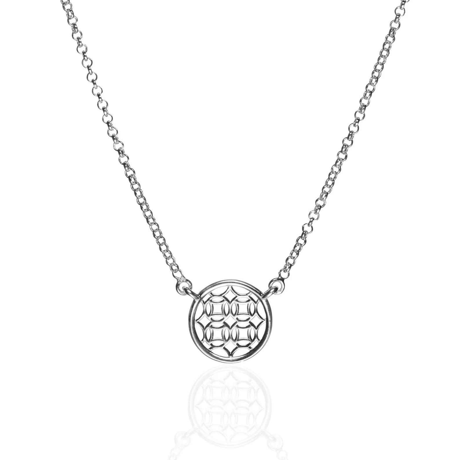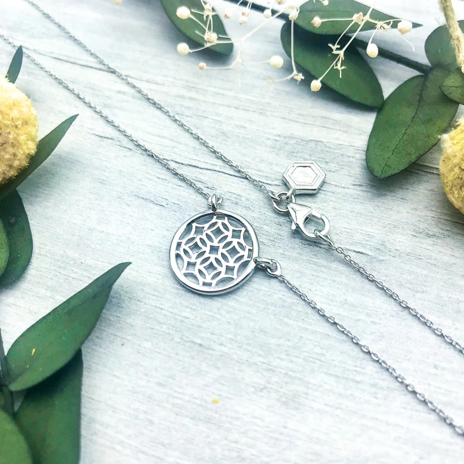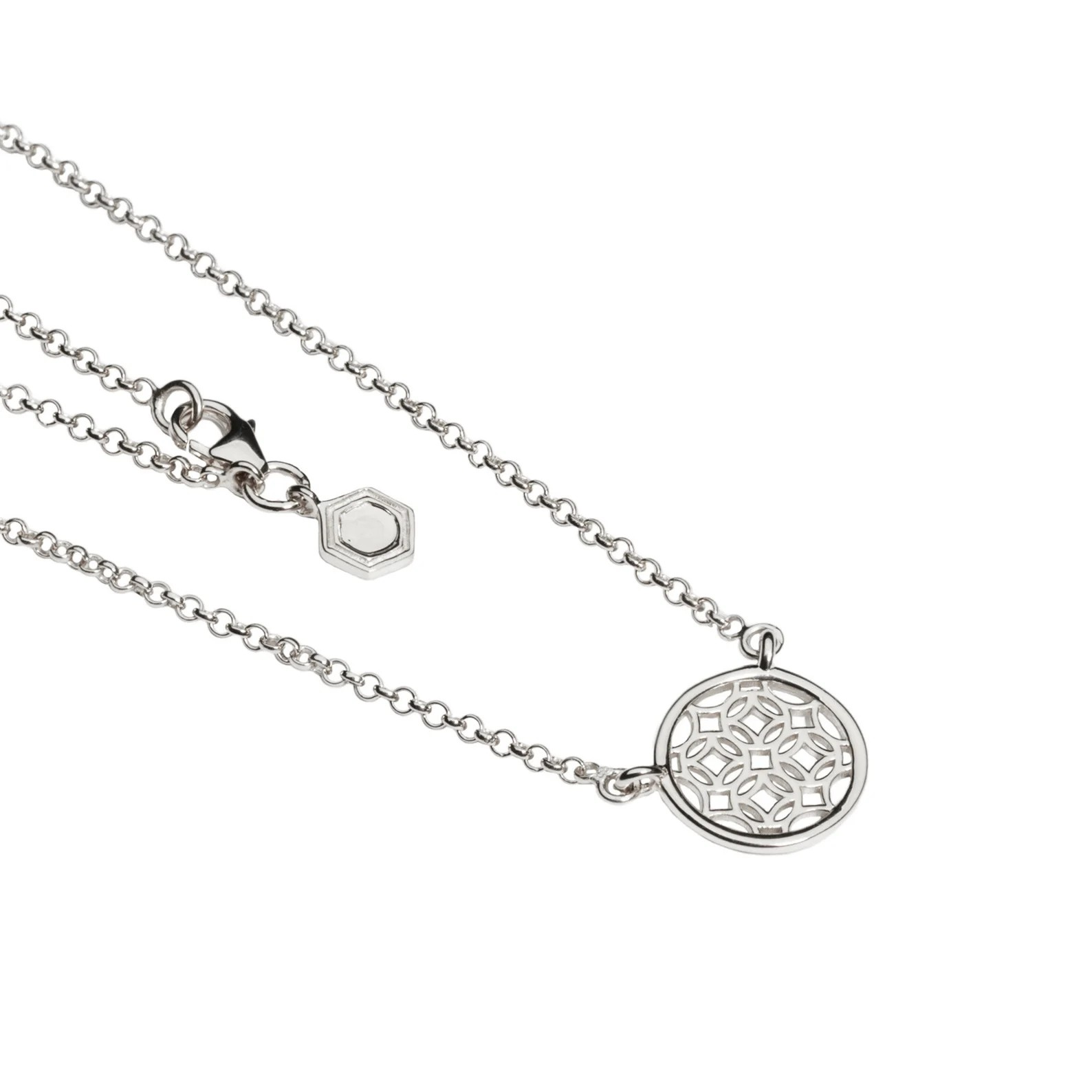 Take your look from plain to polished every day. Inspired by femininity, this necklace has a fine lace interior and a bold outer edge, making it both delicate and strong. The eye-catching geometric filigree pendant is designed to sit at the perfect length for daily wear.