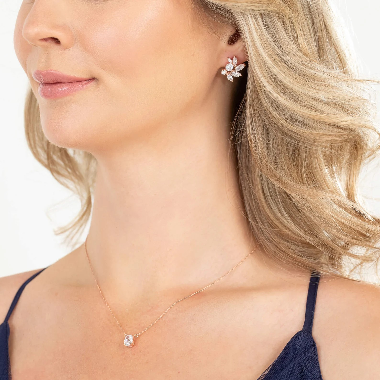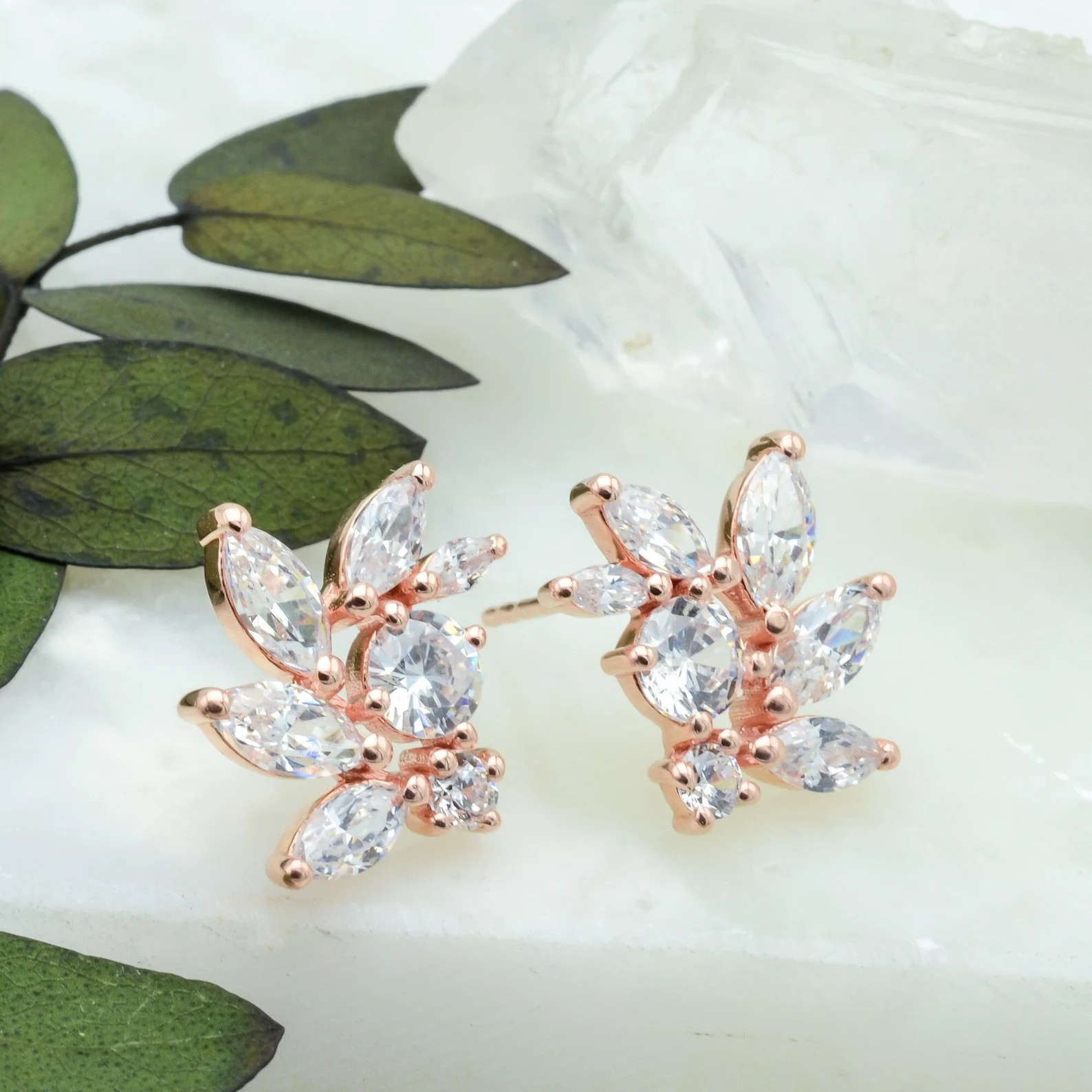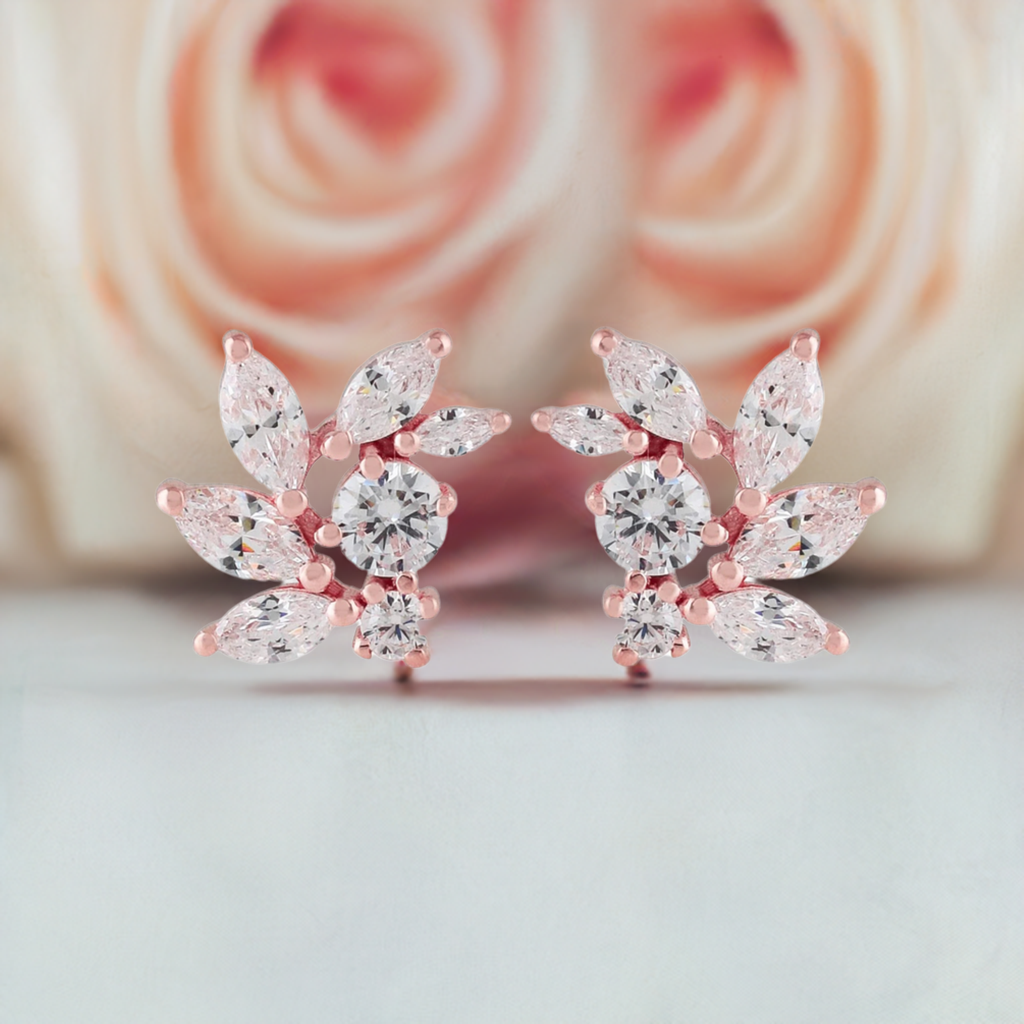 Like a rose in bloom, these earrings are a sophisticated and romantic way to celebrate your love. Designed by engineer-turned-artist Jennifer Chaitt, this floral-inspired cluster features a graceful arrangement of marquise and round-cut stones in a soft rose gold setting. The result is a timeless yet radiant bridal look, made to be cherished well beyond your wedding day. Lightweight, luminous, and comfortable, these earrings offer long-lasting sparkle and style.