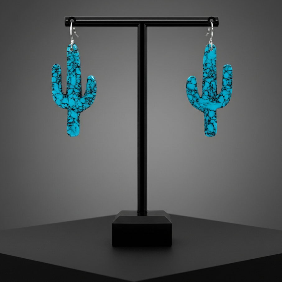 These striking turquoise-color cactus earrings are crafted by Native American artisans from Gibbsite, showcasing a vibrant matrix pattern that adds bold character to any look. The playful cactus silhouette adds a modern desert-chic twist, while sterling silver hooks ensure comfort and security with lightweight ease. Their standout shape and electric color make them a fun, confident accessory for lovers of the Southwest aesthetic.