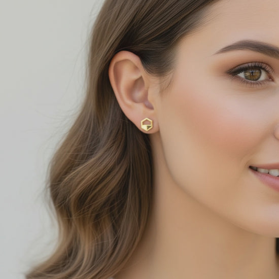 These gold hexagon cutout earrings will become instant wardrobe staples, offering a modern, geometric take on the half moon stud earring. Designed by engineer-turned-artist Jennifer Chaitt, their low-profile silhouette makes them ideal for the minimalist who values both edge and elegance. The clean lines and open space create visual balance, making these earrings a sleek and stylish go-to for everyday wear or standout moments.
