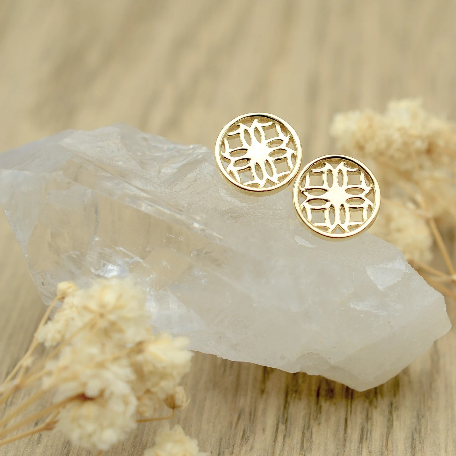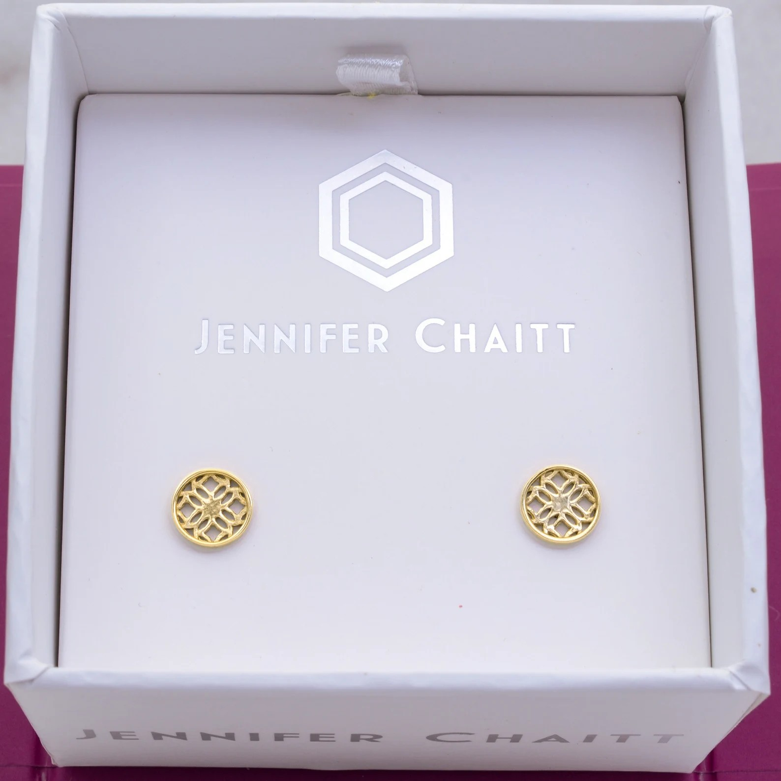 Inspired by femininity, this modern lace earring is both delicate and strong. The low-profile silhouette was thoughtfully designed by engineer-turned-artist Jennifer Chaitt for moms and other on-the-go women. The durable construction and rounded edge reduce the risk of scratches, snags, or discomfort—letting you stay close to loved ones without compromise. Featuring a gold-toned filigree interior framed by a protective circular rim, this piece blends functionality with quiet elegance.