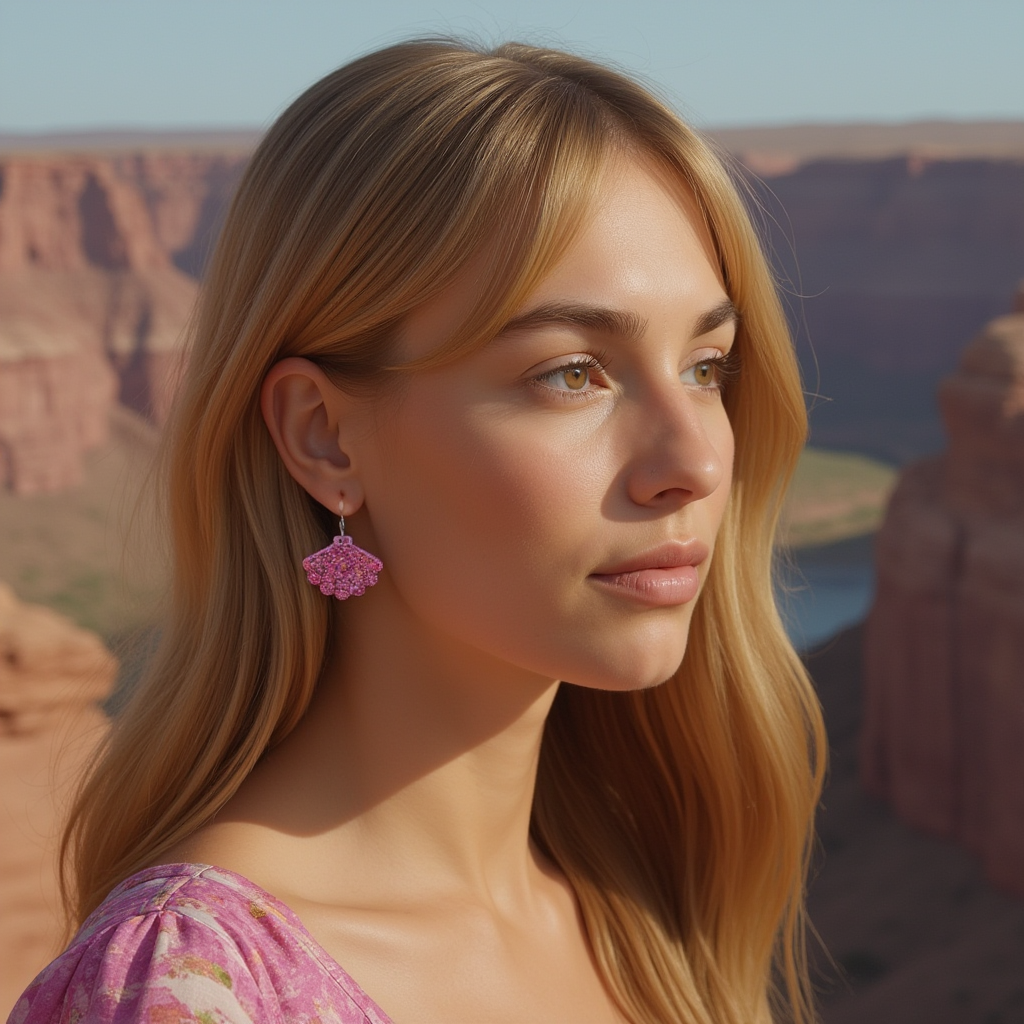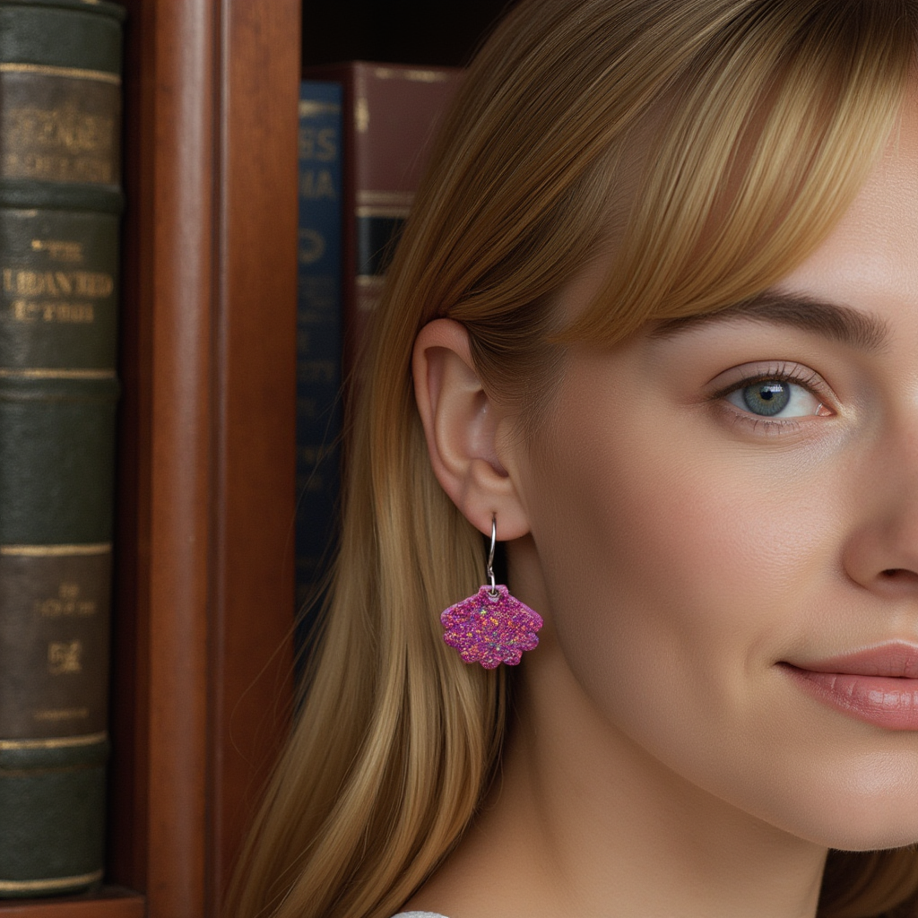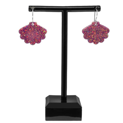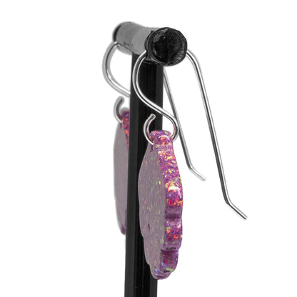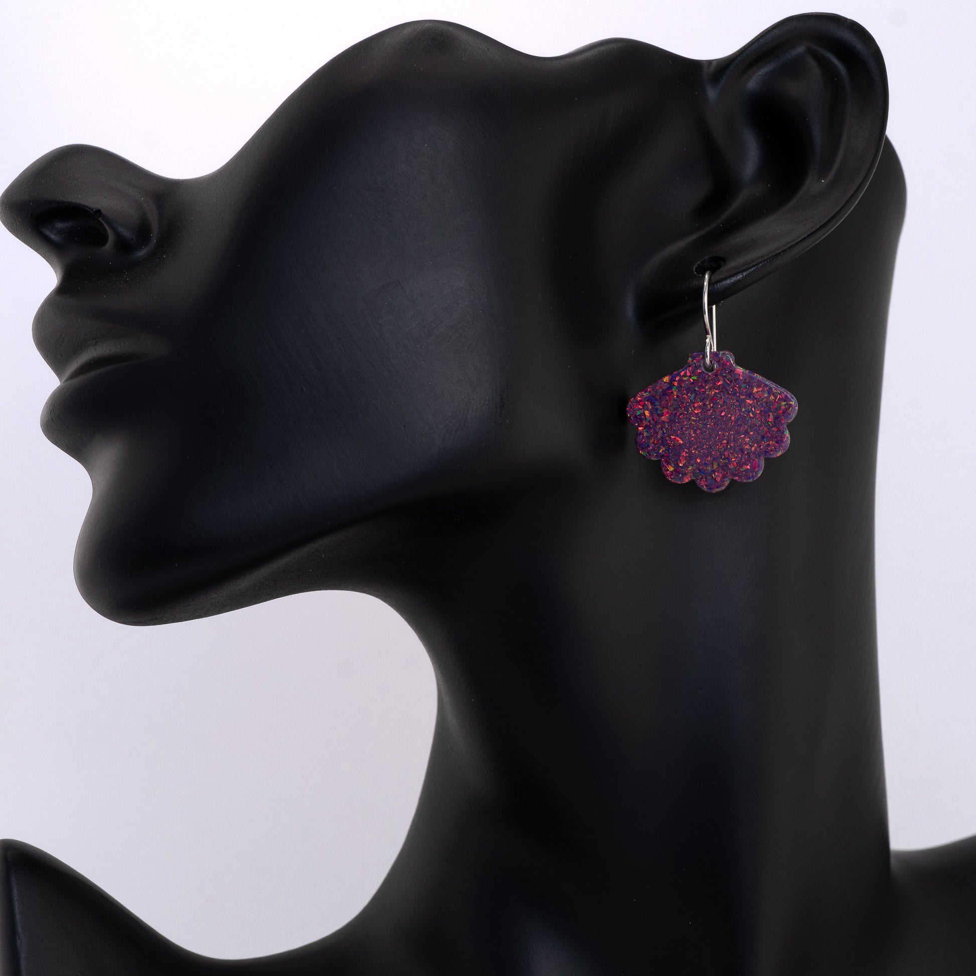 These vibrant seashell-shaped opal earrings are a stunning display of crafted Native American artistry. Infused with bold purples and sparkling flecks of red, gold, and fuchsia, each earring captures the playful shimmer of ocean light. The scalloped silhouette adds a whimsical touch, while the high-quality sterling silver hooks ensure long-lasting comfort and wear.
