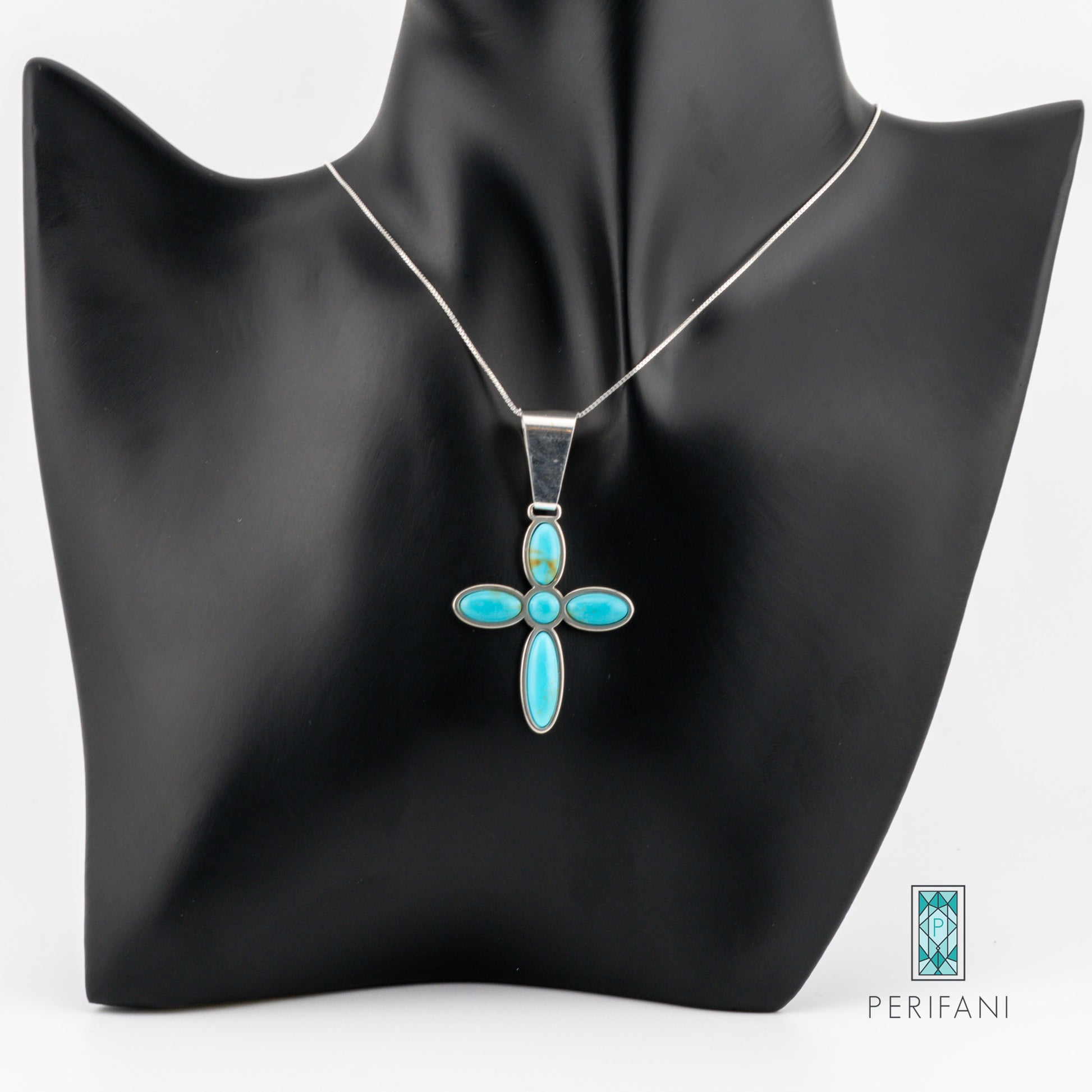 Embrace a refined statement of Southwestern style with these cross-shaped turquoise earrings and pendant necklace, crafted by Native American Michael Budick. Each piece boasts four elongated oval turquoise stones arranged symmetrically to form a striking cross. A smaller, circular turquoise stone at the center seamlessly connects the design, lending a balanced and elegant look.