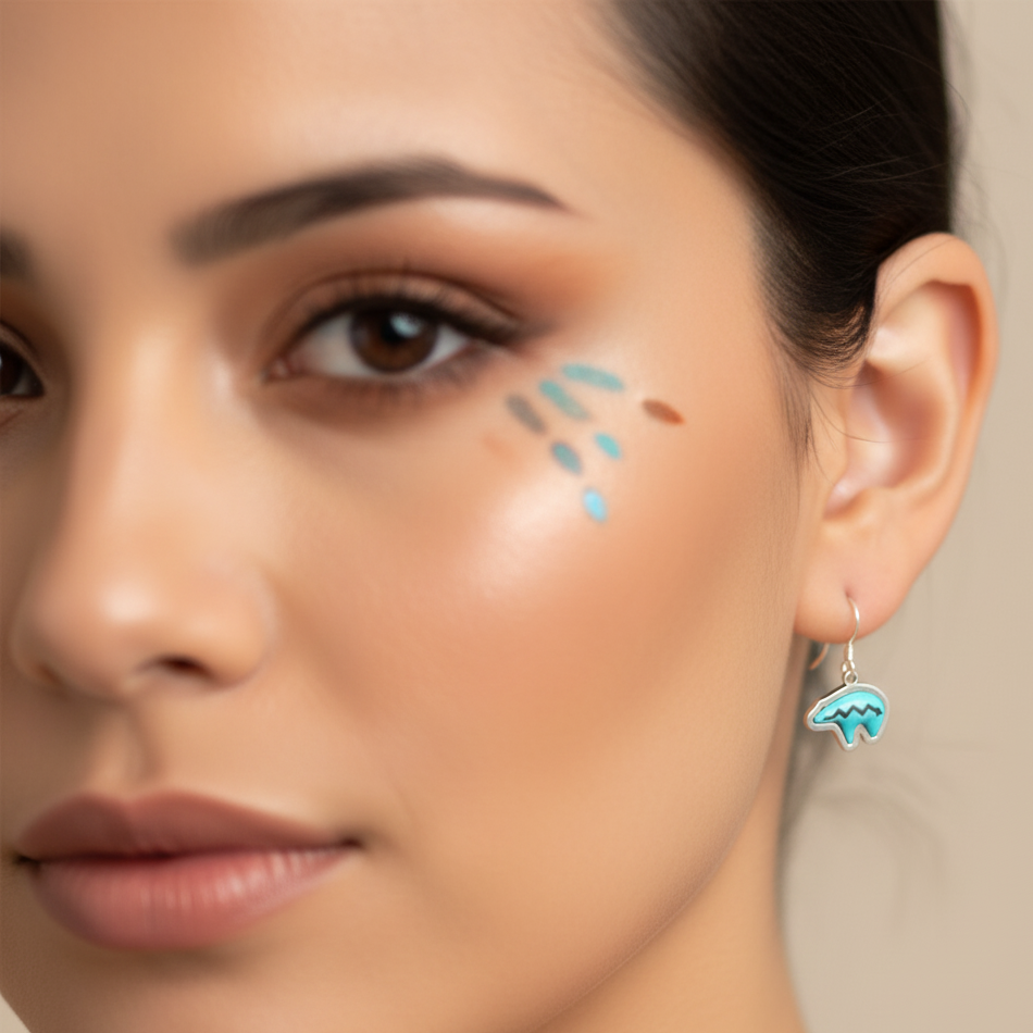 This coordinated set features a symbolic bear-heartline pendant on a sleek box chain with matching dangle earrings. Vivid turquoise is framed by polished sterling silver for crisp contrast and everyday shine. The hooks are made of sterling silver.