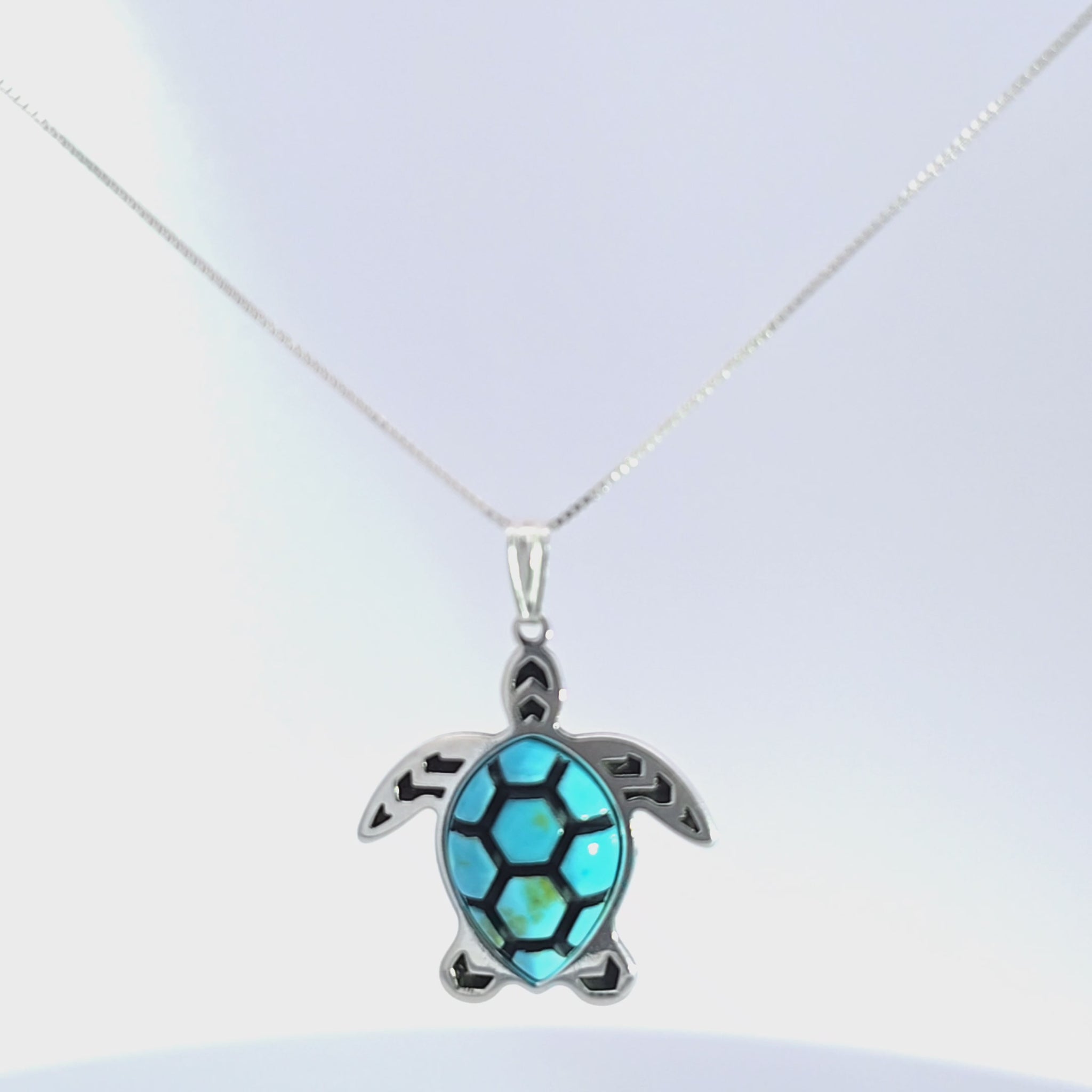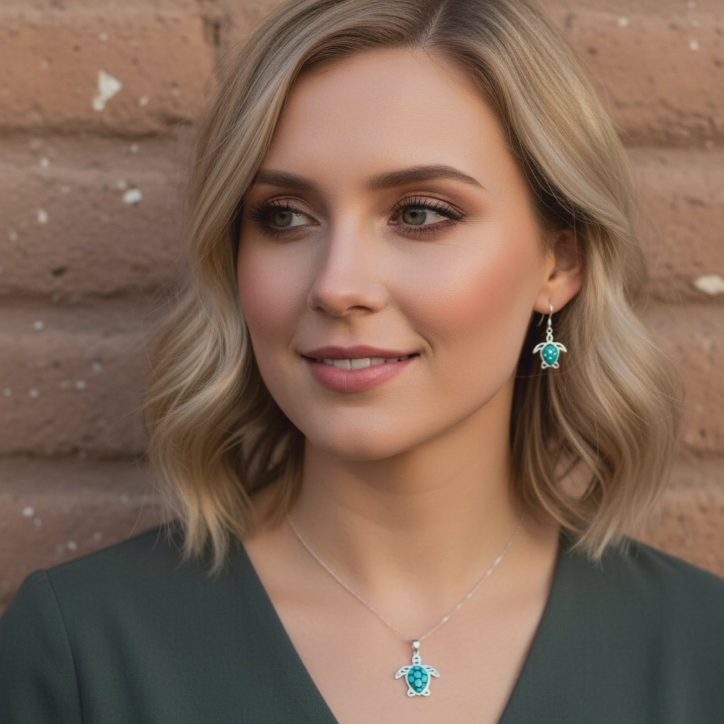 This coordinated sea-turtle set pairs a luminous turquoise-shell pendant on a sleek box chain with matching dangle earrings framed in polished sterling silver. The hooks are made of sterling silver, offering comfortable, long-lasting wear.