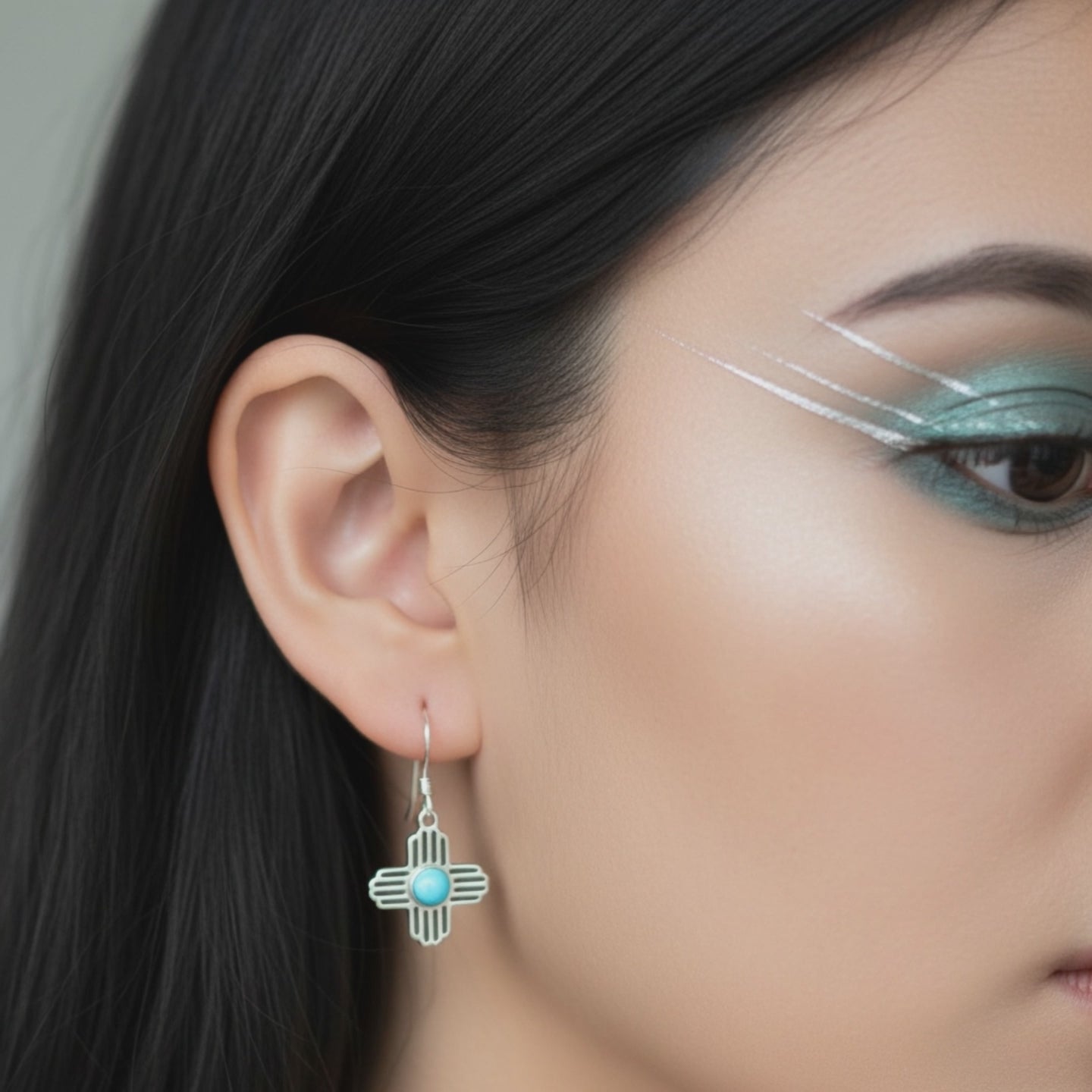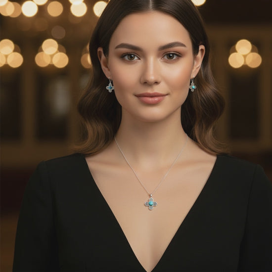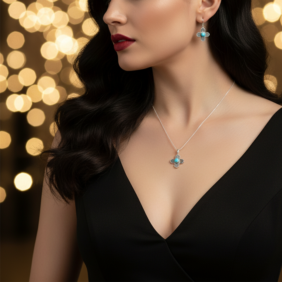 This coordinated set features the iconic Zia sun symbol with a vivid turquoise center framed by polished sterling silver; the pendant hangs from a sleek box chain and the earring hooks are made of sterling silver for comfortable wear and lasting shine.