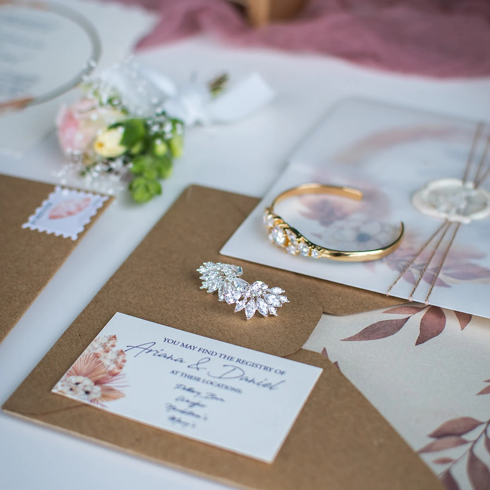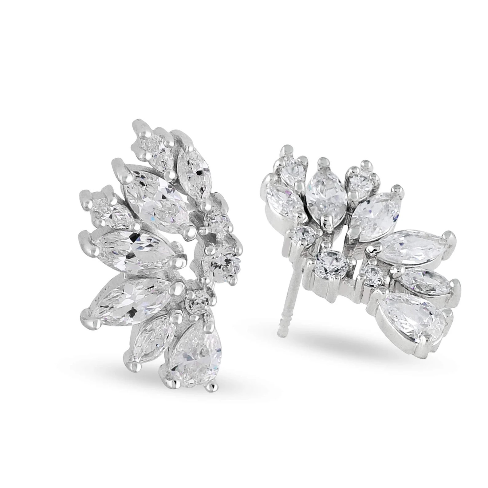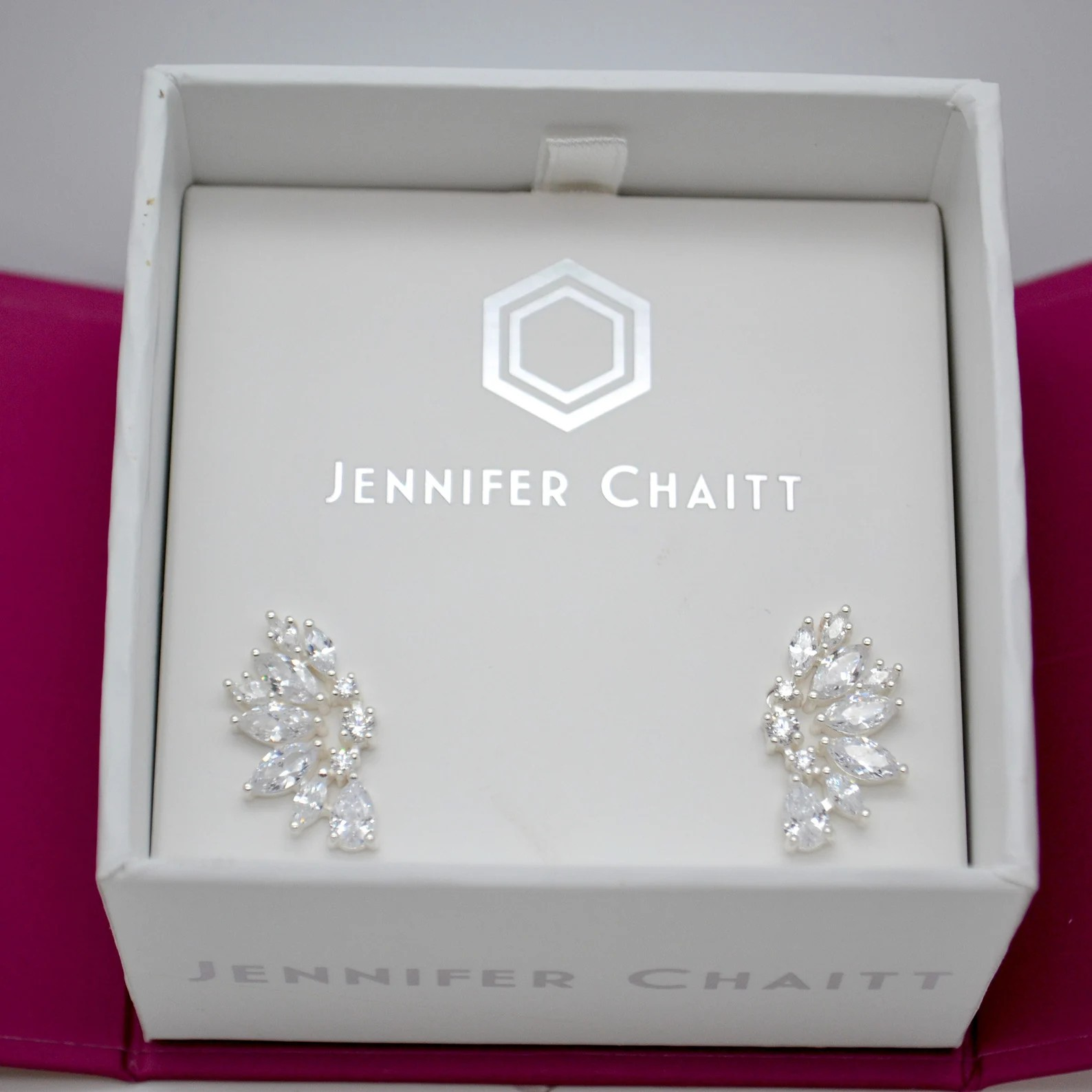 Add a sentimental touch to your wedding day look with these angel wing-shaped earrings. Designed by engineer-turned-artist Jennifer Chaitt, each curve and sparkle is crafted to reflect light from every angle. The marquise and pear-shaped stones are arranged in a graceful winged arc that flatters the ear while creating an ethereal shimmer. Lightweight, durable, and timeless, these earrings are made to last far beyond the ceremony, allowing you to relive those radiant moments again and again.