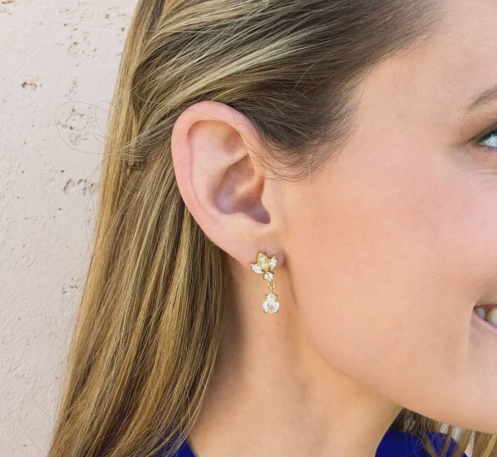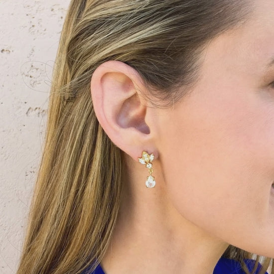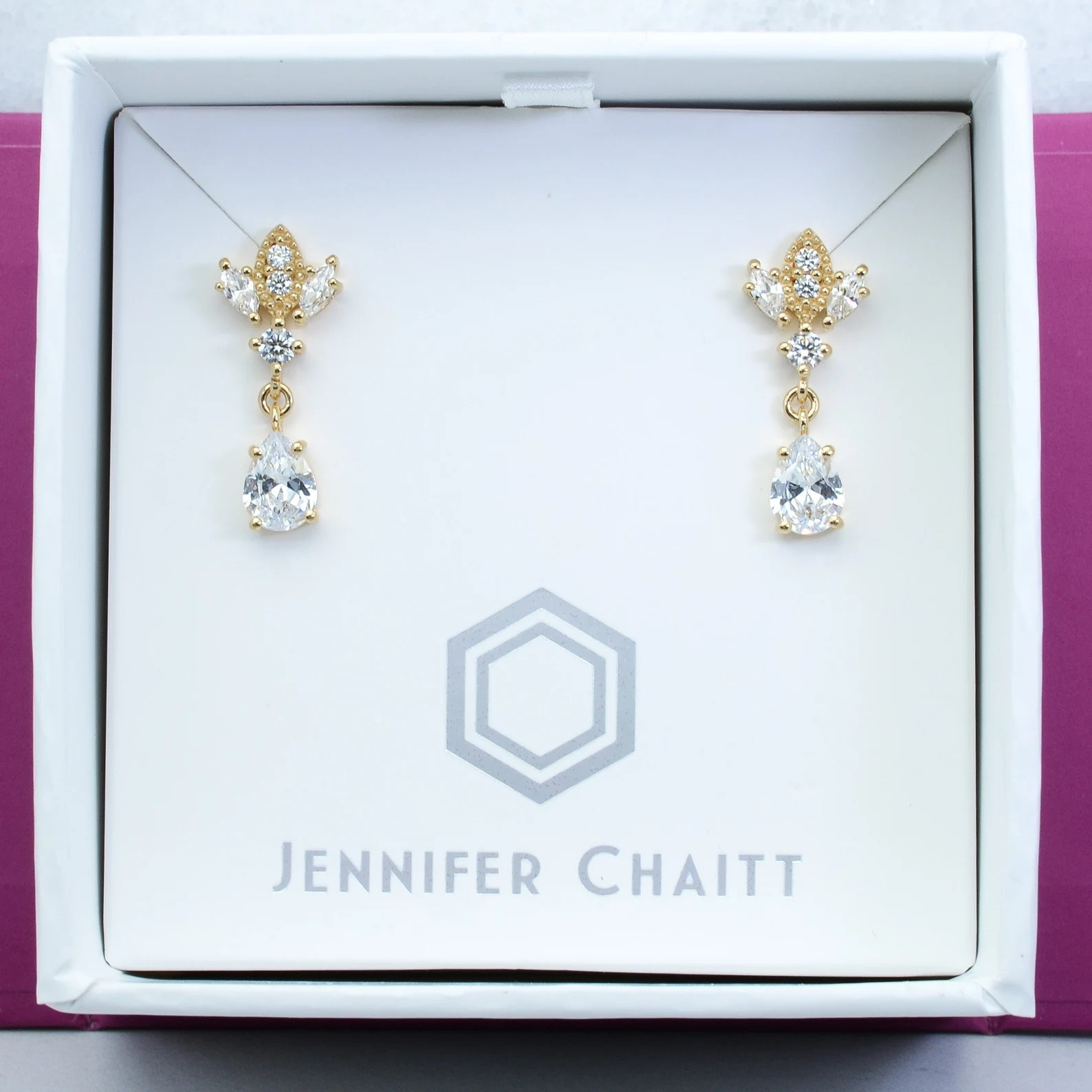 Create a dreamy, vintage vibe on your wedding day. These gold-tone drop earrings are intricately detailed with delicate milgrain edging and pavé stone clusters, capturing the timeless elegance of the Art Deco era. Finished with a sparkling pear-shaped drop, this romantic silhouette was designed by engineer-turned-artist Jennifer Chaitt to evoke refinement, grace, and heirloom beauty. Lightweight and luminous, these earrings are comfortable enough for all-day wear—from your walk down the aisle to your final dance of the night.